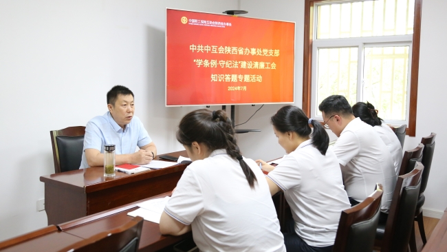 为扎实推进党纪学习教育,引导党员干部学纪、知纪、明纪、守纪。中互会陕西省办事处党支部积极响应中共陕西省总工会党组党纪学习教育工作专班的号召,认真落实“学条例·守纪法”建设清廉工会知识答题活动的相关要求,7月12日,办事处在主题党日活动时间组织全体党员进行笔试答题。